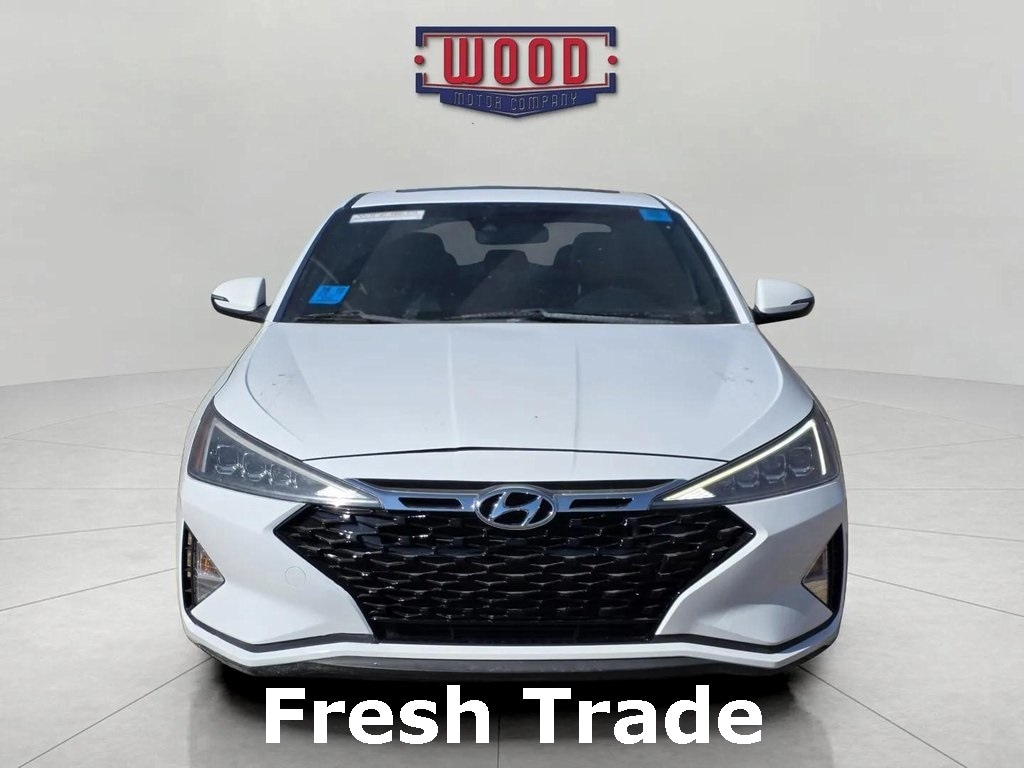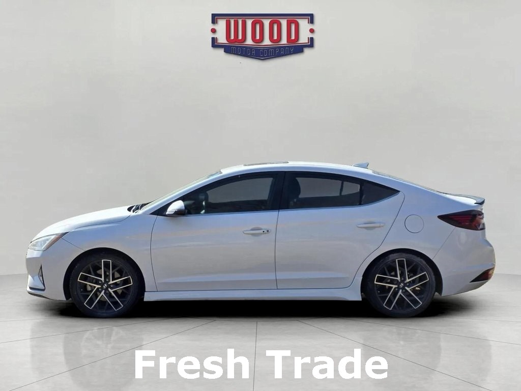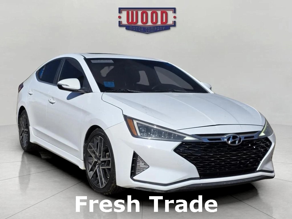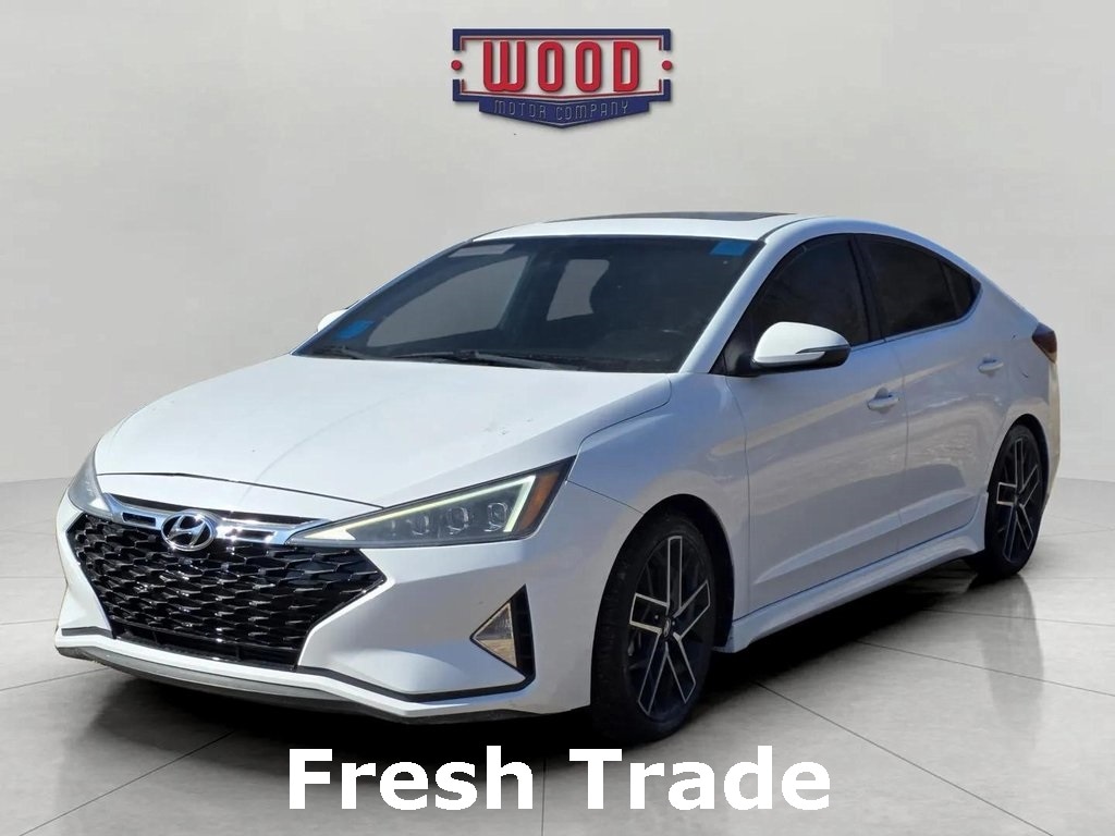 Clean CARFAX. Elantra Sport, 4D Sedan, 1.6L I4 DGI Turbocharged DOHC 16V LEV3-ULEV125 201hp, 7-Speed Automatic, FWD, Ceramic White, Black w/Leather Seating Surfaces, AM/FM radio: SiriusXM, Apple CarPlay & Android Auto, Auto High-beam Headlights, Dual front side impact airbags, Electronic Stability Control, Exterior Parking Camera Rear, Front Bucket Seats, Fully automatic headlights, Heated Front Bucket Seats, Heated front seats, Knee airbag, Leather Seating Surfaces, Low tire pressure warning, Option Group 01, Outside temperature display, Overhead airbag, Power moonroof, Power windows, Radio: AM/FM/HD/SiriusXM/MP3 Display Audio, Rear anti-roll bar, Remote keyless entry, Security system, Speed control, Split folding rear seat, Steering wheel mounted audio controls, Telescoping steering wheel, Tilt steering wheel, Traction control. Ceramic White 2019 Hyundai Elantra Sport FWD 7-Speed Automatic 1.6L I4 DGI Turbocharged DOHC 16V LEV3-ULEV125 201hp